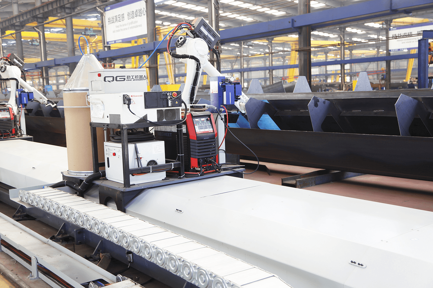 此條焊接流水線長度25米,安裝有四臺日本川崎焊接機器人,可焊接公司標準產品10.5m--22.5m各種規格單梁內縫,焊接范圍包括筋板底部、側面、板條等一次性焊接完成。